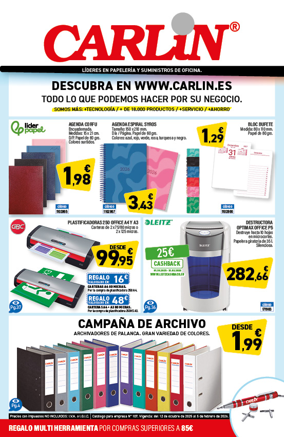 Desde que en 1989 nace Carlin, nuestros catálogos han sido una señal de identidad, siendo pioneros desde entonces reuniendo en un mismo soporte a proveedores y productos de primer nivel con precios competitivos, regalos por compras y miles de referencias en un mismo lugar.Carlin cambió la filosofía de las papelerías tradicionales, donde un mostrador separaba al cliente de los productos y el dependiente buscaba los productos que le habían solicitado. El concepto de autoservicio o self - service se implantó y nació un nuevo concepto de papelería bajo la marca Carlin.Desde entonces, y a través de nuestro amplia red de franquicias de papelería siempre hay un Carlin cerca de ti. Mas de 200 tiendas repartidas a lo largo del territorio nacional, además de contar con presencia internacional en Portugal, Andorra y Guinea Ecuatorial. Localiza tu tienda Carlin más cercana en este enlace Localiza tu tienda Carlin Además de nuestros tiendas y catálogos, en www.carlin.es contamos con más de 18.000 productos con servicio de entrega en 24 H. en península, gracias a la ubicación estratégica de nuestros almacenes logísticos. Nuestra finalidad es daros un servicio integral acorde a vuestras necesidades; contamos con mobiliario de oficina, tecnología, escritura técnica y profesional de alta gama, archivo, complementos de oficina, manipulado, consumibles de informática originales y compatibles, productos escolares, tecnología, manualidades, regalos... y mucho más.