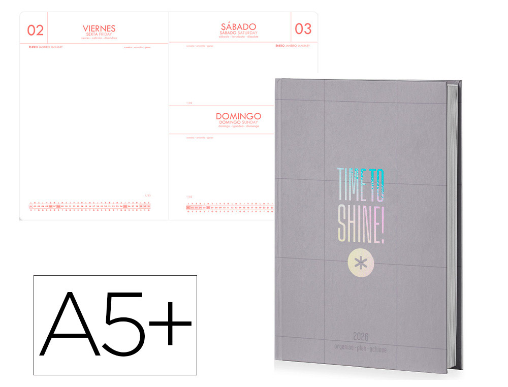 - Formato y diseño: Agenda encuadernada con acabados modernos y gráficos inspiradores bajo el tema Time to Shine, aportando un toque motivacional y estético.